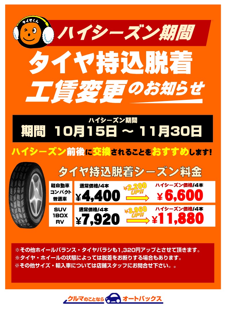 タイヤ持込脱着ハイシーズン価格のご案内