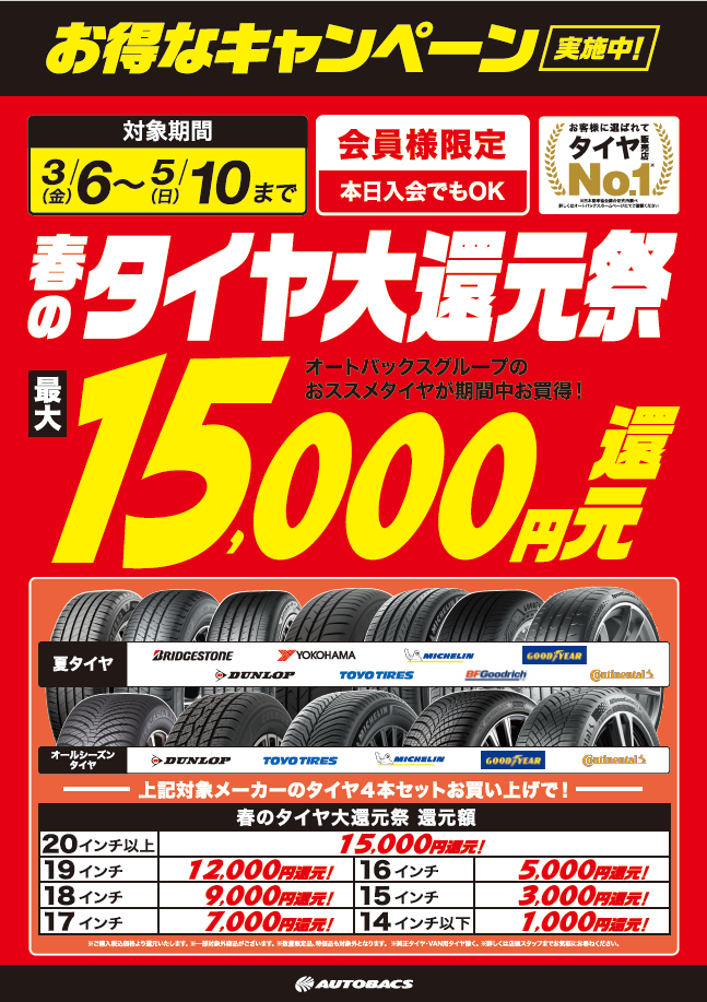 対象メーカーのタイヤ4本セットでのお買い上げで最大15,000円還元!